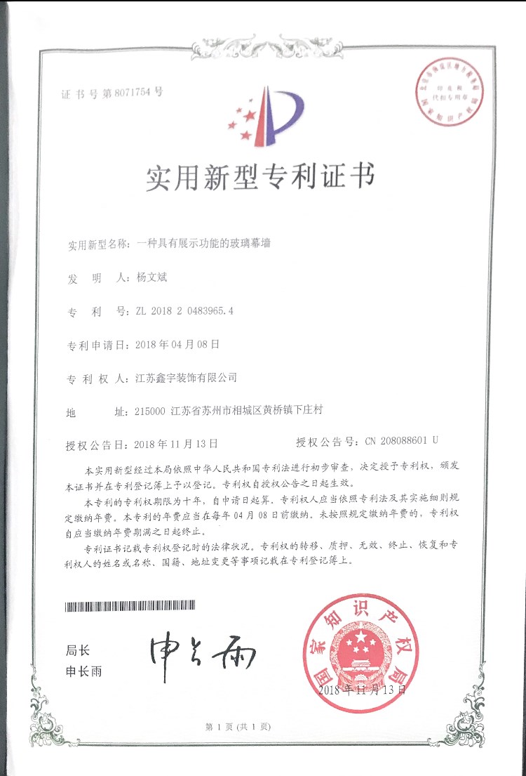 當前位置:首頁 / 關(guān)于鑫宇 / 企業(yè)資質(zhì)一種具有展示功能的玻璃幕墻實用新型專利證書