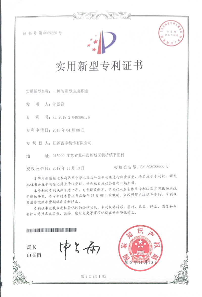 當(dāng)前位置:首頁 / 關(guān)于鑫宇 / 企業(yè)資質(zhì)一種防震型玻璃幕墻實(shí)用新型專利證書